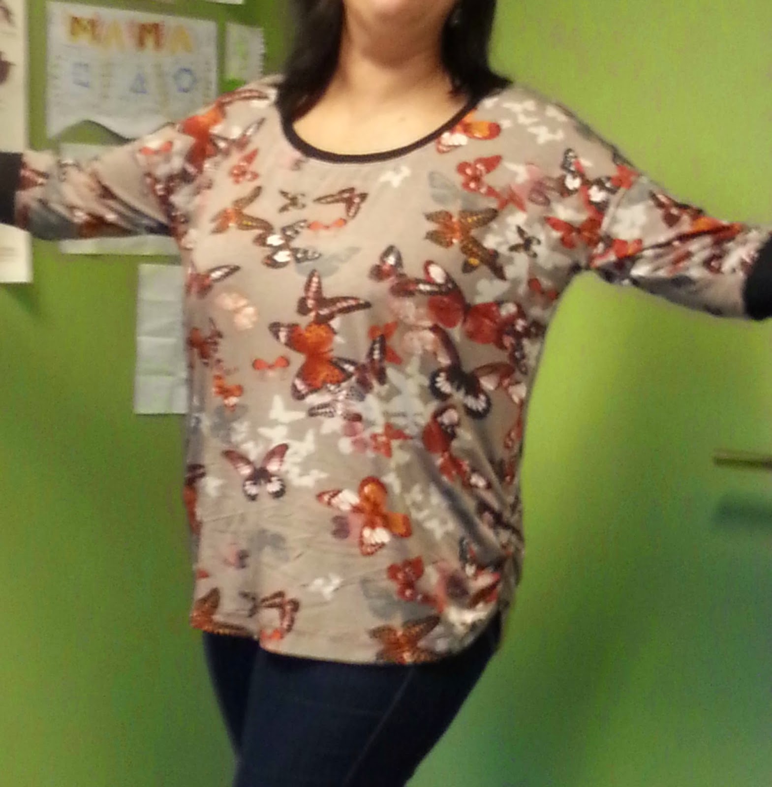 Esta vez lleva mangas francesas con puños en negro, igual que el cuello.