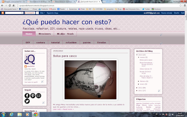 Para hacer estos cambios me ayudaron mucho los tutoriales de Las creaciones de Bea y Natalia, Mamá, quiero ser blogger y Personalización de blogs. Entre todos ellos y mi duro trabajo con PicMonkey para diseñar la cabecera, el fondo, las pestañas y algún botón, he conseguido cambiar bastante el aspecto del blog.