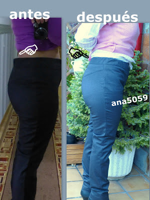 3º La parte posterior de la cintura era un poco holgada, así que introduje una goma ancha. Ahora parecen unos jeggins, treggins o annings. Son mucho más cómodos.