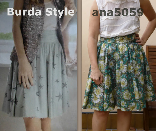 Cuando compré la tela (creo que es batista de algodón) ya os conté que primero pensé en una blusa de cuello halter, pero luego probando sobre Anastasia la idea de la falda fue ganándome. Así que me decidí por este modelo (que no es el de la portada, aunque lo parece) y de paso cumplo con el reto Burda Challenge.